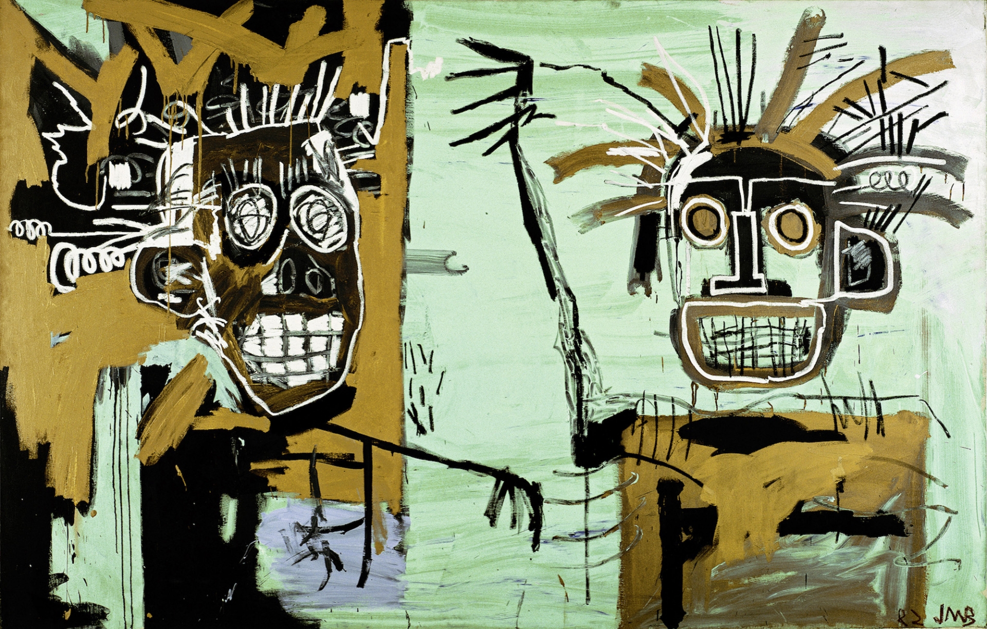 Untitled (Two on Gold) Jean-Michel Basquiat 1982 203 cm × 317.5 cm | 79.9 in x 125 in Acrylic and oilstick on canvas Style Contemporary art Location Galerie Enrico Navarra, Paris Back to Jean-Michel Basquiat